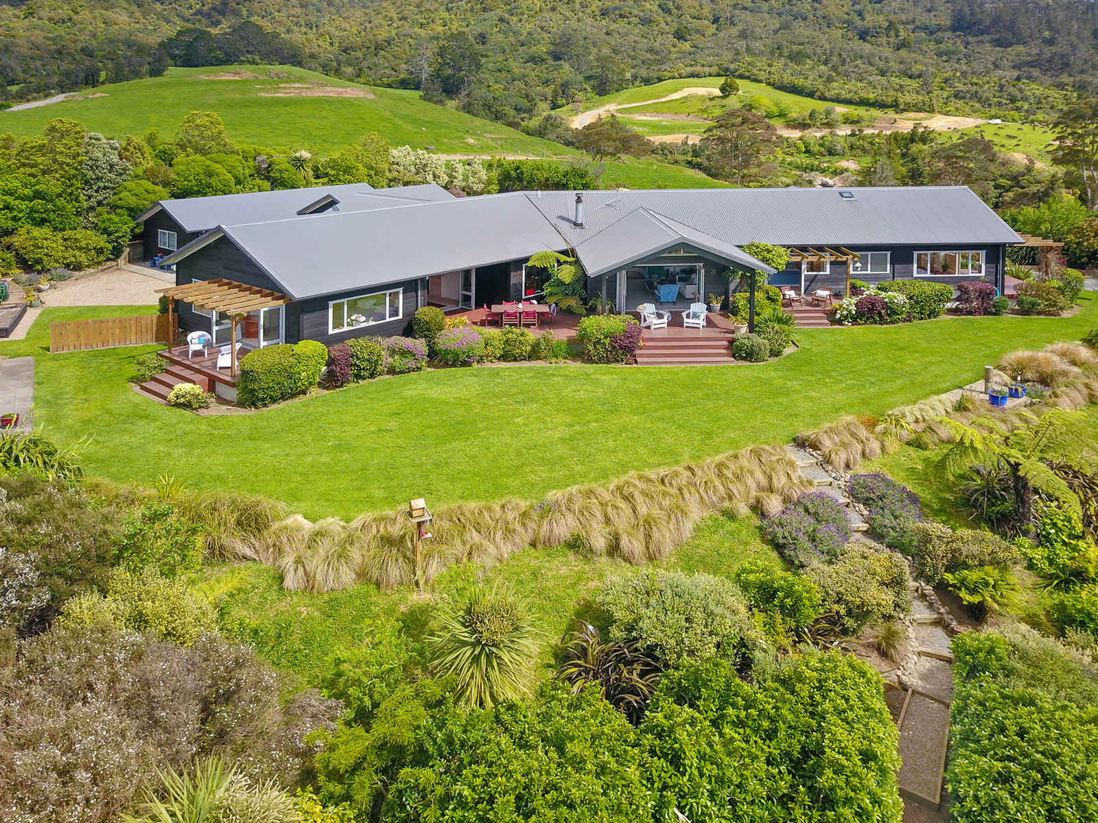 The home comprises of four spacious double bedrooms, each with its own bathroom, private deck, and separate entrance. The master suite is thoughtfully positioned for privacy, while a guest wing complete with kitchenette provides the perfect setup for extended family, teenagers, or visitors. Also features a warm blonded wood interior, plenty of sun, heat pump and a cosy wood-burner.