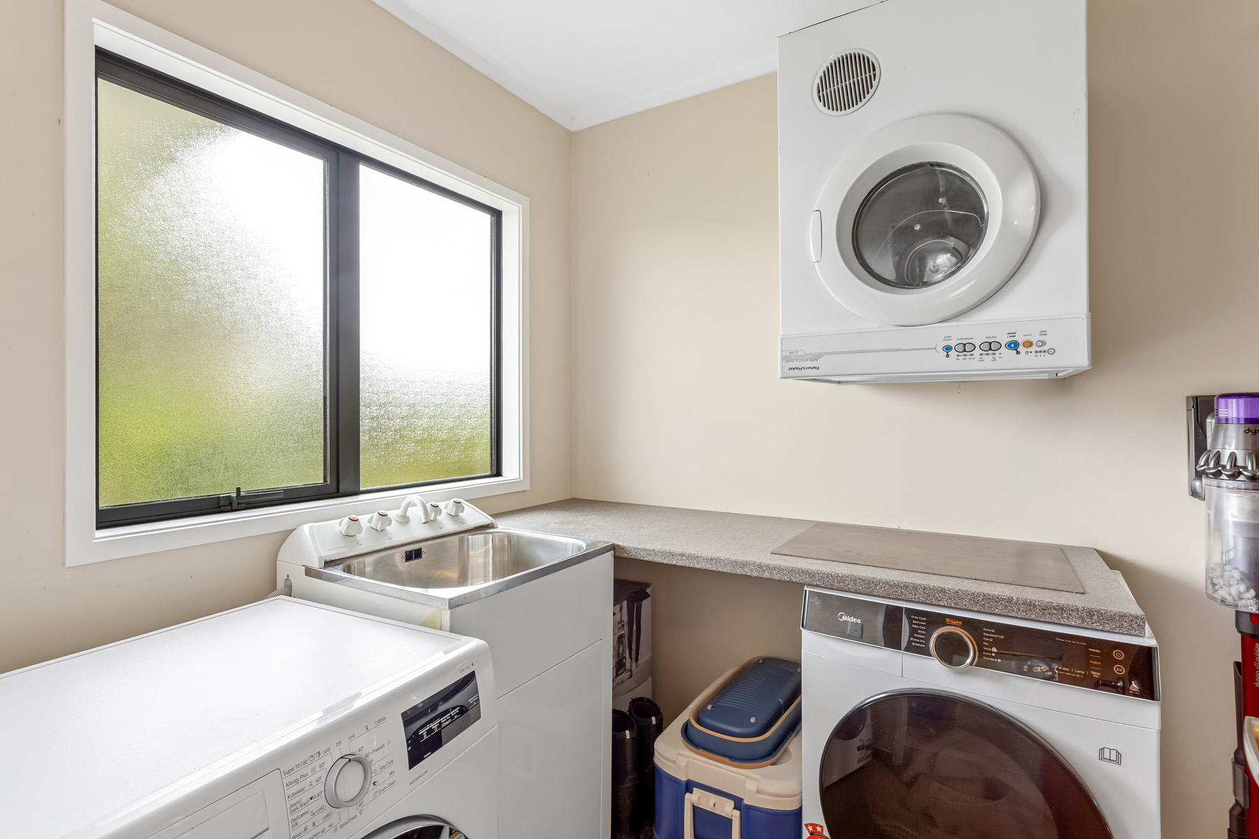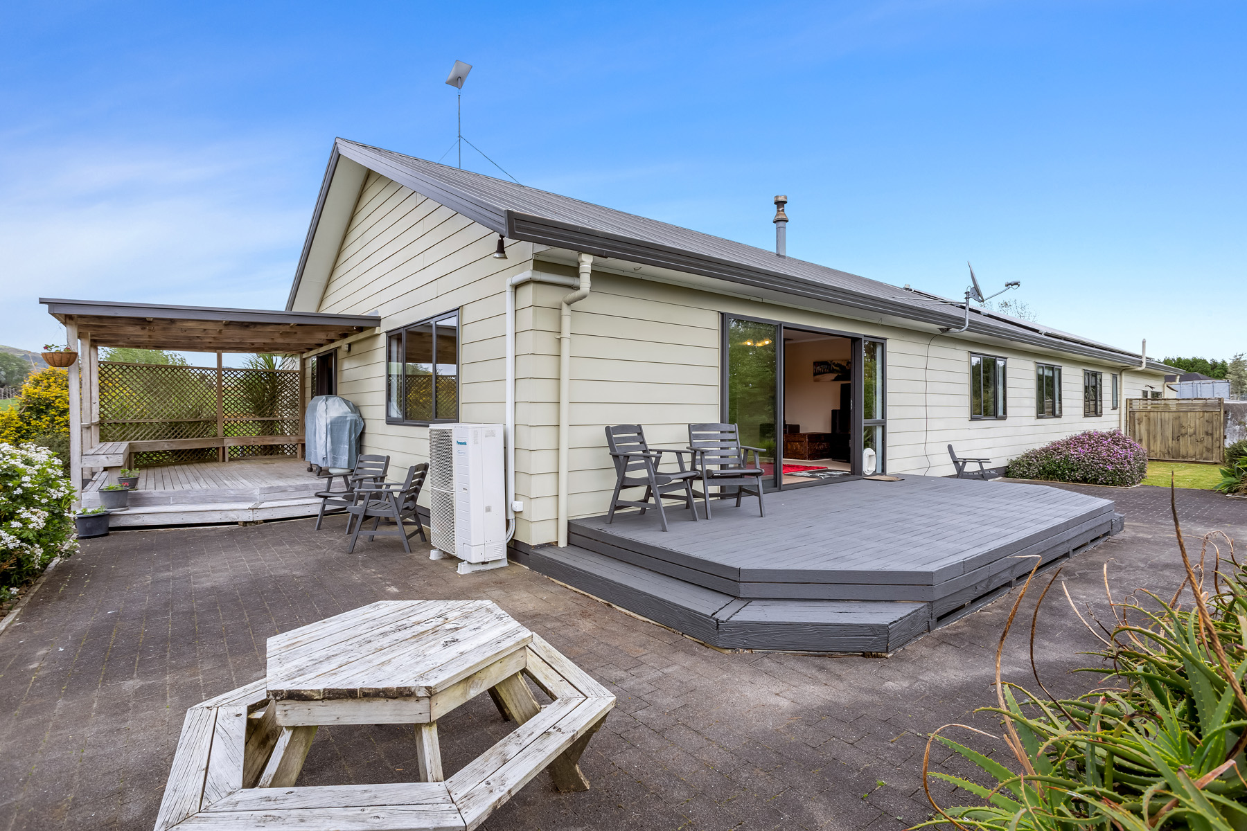 Inside, comfort and efficiency are paramount with double glazing throughout, upgraded ceiling and floor insulation, a freestanding fireplace, large heat pump in the living room, DVS system, 8kW solar panels, electric hot water, and an alarm system.