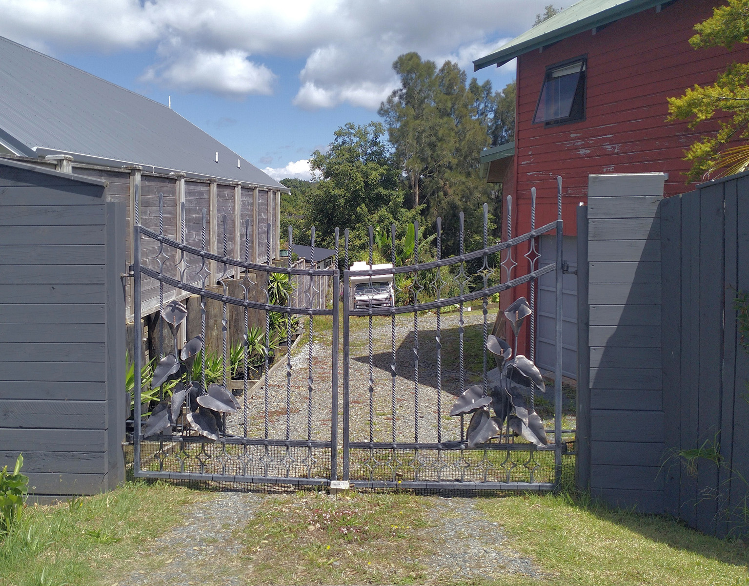 - Formed driveway with corridor crossing and automated, artistically designed, custom built, automated wrought iron gates featuring lilies