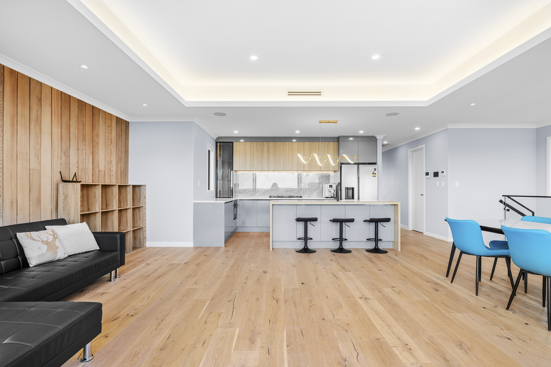 The modern open-plan kitchen forms the heart of the home, complete with stone benchtops, quality appliances, ample storage, and a central island bench ideal for casual dining or entertaining. High ceilings and expansive glazing enhance the sense of space, while double glazing, a heat pump, and quality flooring ensure year-round comfort. Abundant natural light fills the open-plan living areas, creating a warm and welcoming atmosphere throughout.